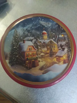 Bonita lata de chapa con un diseño invernal de un pueblo nevado. - Ideal para decoración. - Motivo de paisaje montañoso con casas y árboles. - Borde exterior en color rojo y dorado.
