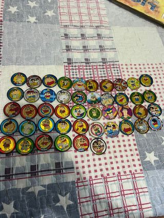 Colección de tazos o chapas de Shinchan de Bollycao. Perfectos para coleccionistas. Son 46 tazos - Diseños variados de Shinchan y sus amigos. - Cada cromo tiene un diámetro de 3 cm.