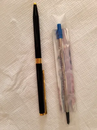 Elegante bolígrafo Dupont con acabado lacado en negro y detalles chapados en oro. Incluye un recambio de tinta azul. - Cuerpo lacado en negro. - Detalles chapados en oro. - Clip metálico dorado. - Recambio de tinta azul, tamaño mediano.