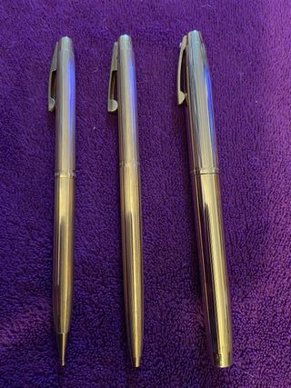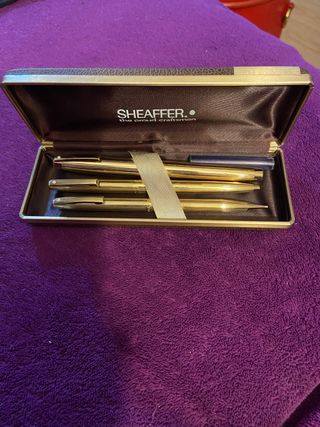 Elegante estuche de la marca Sheaffer, con un acabado chapado en oro. Consta de pluma, bolígrafo y portaminas , en perfecto estado. - Diseño clásico y sofisticado.