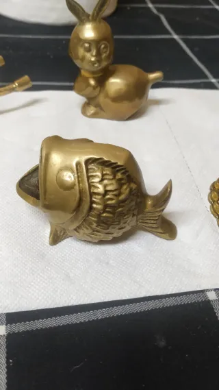 Preciosas figuras de bronce todo el pak se vende. Son todas de bronce muy antiguas y se compone el pak de 8 piezas . 1.- candelabro, medida: 17cm alto x 7cm ancho. 2.-- pez, medida: 12cm ancho x 7cm alto. 3.- buda, medida: 4cm alto x 3,5 cm ancho. 4.- carretilla portacerilla, 15,5cm ancho x 6cm alto. 5.- chapa Dama, medida: 8cm alto x 6,5cm ancho. 6.- mortero con maza, medida: 5cm ancho x 9cm alto con mano. 7.- campanilla, medida: 8,5cm alto x 5,5cm ancho. 8.- conejito, medida: 11cm alto x 8 cm ancho.