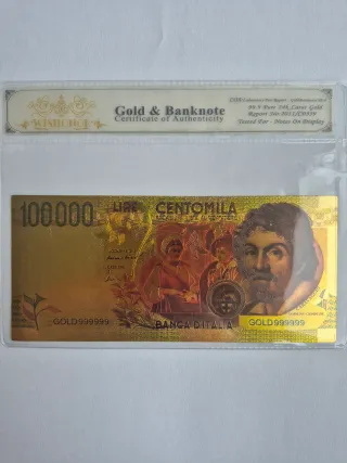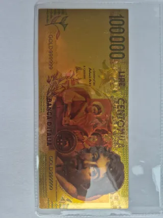 Reproducción de billete italiano de 100.000 Liras, chapado en oro de 24 quilates. - Diseño conmemorativo. - Incluye certificado de autenticidad. - Acabado brillante Curioso artículo para coleccionistas.