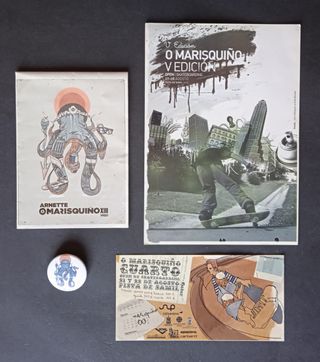 Lote de artículos promocionales del evento o marisquiño.Varias ediciones,años.Incluye chapa,y tres panfletos informativos.Skate,pulpo,bmx... 🫱🏻🫲🏼Trato en mano. 📦Envíos:Wallapop y Pay Pal.