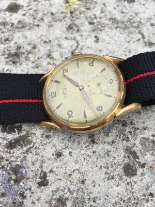 👉 Reloj Landi de cuerda manual, un clásico con estilo. 👉Esfera con números arábigos y marcadores. 👉 Subesfera para los segundos. 👉 Correa de tela negra con detalles rojos 👉 La caja de 37mm chapada en oro de asas curvadas y largas 👉 la tapa trasera de acero inoxidable. 👉En funcionamiento dado su aspecto y edad, es probable que el reloj requiera un servicio completo de limpiar y lubricar el movimiento. 👉La esfera presenta una notable pátina (envejecimiento), 👉 Las manecillas parecen estar en buen estado. 👉El cristal podría reemplazarse presenta una grieta 👉#Vintagewatch#Landiwatch#17Rubis #Manualwind#Swissmade