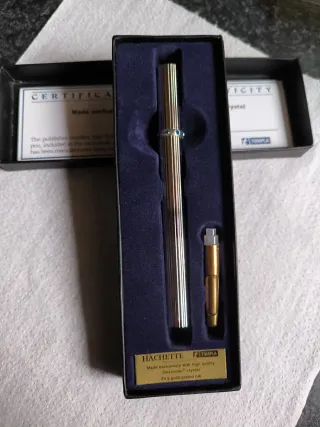Elegante pluma estilográfica Hachette. Le falta una piedra. - Fabricada exclusivamente con cristal Swarovski de alta calidad. - Punta chapada en oro de 24 quilates. - Incluye estuche y certificado.