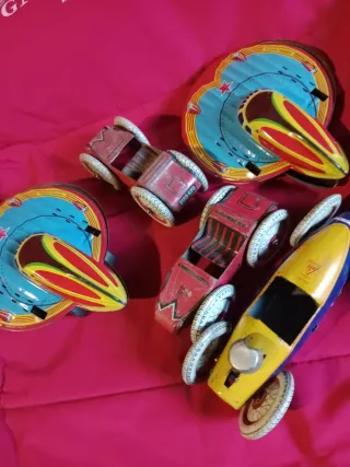 Conjunto de cinco vehículos de chapa de la marca SFA Paris, fabricados en los años 50. Piezas de colección con un diseño retro son , coches y naves especiales de la época. - Fabricados en chapa metálica - Diseño de coches de carreras. - Colores vibrantes y detalles pintados.