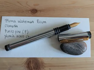 Pluma estilográfica Waterman Forum. - Cuerpo metálico cromado color plata, con aros decorativos en gris y negro. - Fabricación francesa original años 80-90. - Plumín chapado en oro. - Compatible con cartuchos estándar o convertidor (no incluido). - Buen estado de conservación, sin golpes ni marcas profundas. - Se entrega limpia.