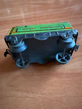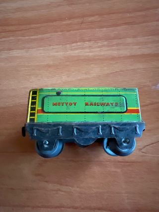 Vagón de tren de colección de la marca Mettoy Railways. - Color verde con detalles en amarillo y rojo. - Diseño clásico de vagón de ferrocarril. - De colección antiguo de chapa
