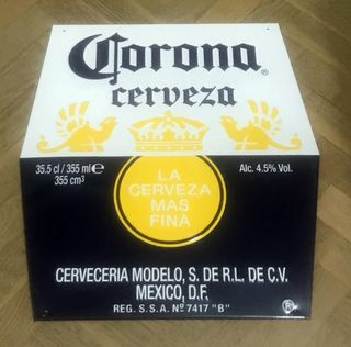 Chapa de publicidad de la cerveza Corona. 43x40 - Diseño clásico con el logo Corona. - Incluye el lema La Cerveza Mas Fina. - Información de volumen: 35.5 cl / 355 ml. - Contenido de alcohol: 4.5% Vol. - Fabricada por Cervecería Modelo, S. de R.L. de C.V. en México, D.F