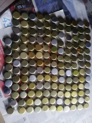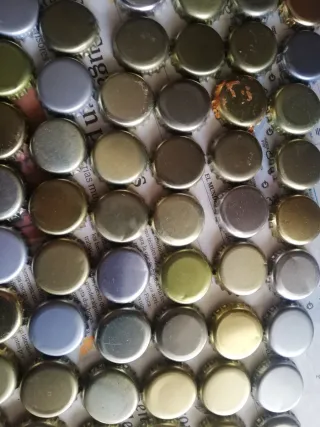 Conjunto de chapas de cerveza de diferentes colores. Ideales para coleccionistas o manualidades. Distintos tonos en plateado y dorado - Chapas metálicas. - Variedad de diseños y tonalidades.