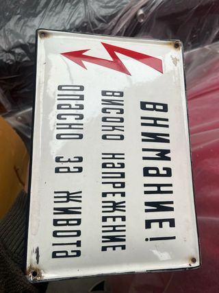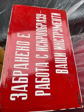 Cartel metálico de origen ruso con texto en cirílico. - Забранено е (Prohibido). - Работа с искрообраз (Trabajo con herramientas que generan chispas). - Ваши Инструменти (Sus herramientas). - Color rojo con letras blancas. la roja 70 y la blanca 50