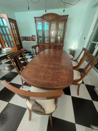 Elegante conjunto de comedor con mesa extensible, vitrina y seis sillas. - Mesa de madera con tablero con chapa de raíz. - Vitrina de madera con puertas de cristal. - Seis sillas de madera con asientos tapizados.