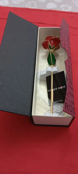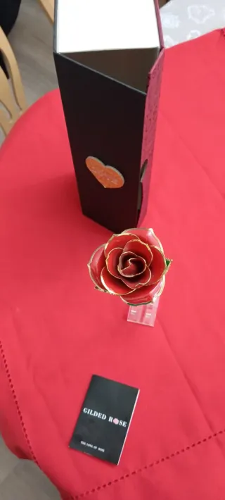Elegante rosa de oro de la marca Gilded Rose. Un detalle único y duradero. Especial para día de los enamorados o cualquier ocasión. - Rosa de color rojo con borde chapado oro 24k - Incluye caja de presentación negra. - Pequeño folleto informativo de Gilded Rose.