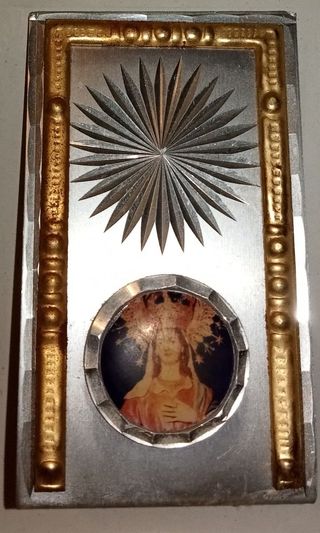 Chapa decorativa con una imagen religiosa de la Virgen María. Presenta un diseño con un marco dorado y un grabado central. - Imagen de la Virgen con corona. - Marco exterior metálico. - Detalle de grabado en forma de estrella.