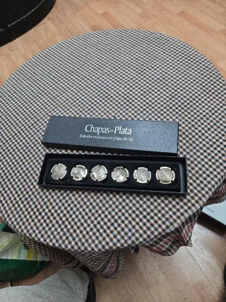 Conjunto de seis chapas de cava de plata. - Diseño grabado. - Presentadas en caja. - Edición exclusiva en plata de ley.