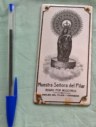 Antigua chapa esmaltada blanca con la imagen de la Virgen del Pilar. - Diseño religioso con la Virgen y el Niño. - Inscripción Nuestra Señora del Pilar, Rogad por Nosotros. - Detalle Anales del Pilar.- Zaragoza. - Bordes con agujeros para sujeción.