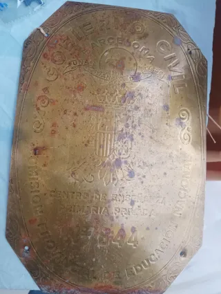 Antigua chapa de latón conmemorativa de Barcelona. - Escudo del Gobierno Civil. - Centro de Enseñanza Primaria Privada. - Comisión Provincial de Educación Nacional. - Año: 1944. Medidas: 23 x 35 ctms.