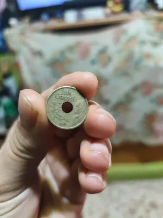 Moneda de 25 pesetas con la efigie de Juan Carlos I. - Año de acuñación: 2001. - Diseño con agujero central.