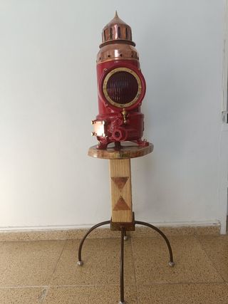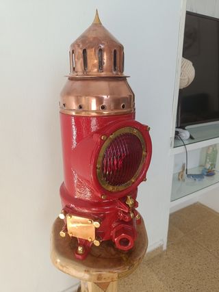 Señal marítima antigua que ha sido restaurada. Presenta un diseño robusto con detalles en cobre y un cuerpo principal en color rojo. - Cuerpo principal de color rojo. - Detalles y remates en cobre. - Lente frontal circular con marco dorado. - Base de madera con soportes metálicos.