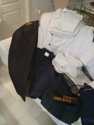 Gran Lote Ropa Militar Armada Española Incluye: Varias Camisas blancas manga corta y larga, petate militar Armada, pantalones oscuros Ignífugo Armada española, pantalón de pinza nuevo Armada Española,Gorra negra Armada, prendas de abrigo azul marino.2 Camisas Iturri negras manga larga talla 40, 2 Camisas manga corta talla 40,Chándal armada española completo,camiseta de Ribete, 2 conjuntos Ropa de cocina conjunto ignífuga, y gorro Ignífugo, botas de trabajo Iturri talla 44, cinta Lepanto Fragata Santa María y otra Esengra, bolsa tren de lavado, corbata con pasa corbatas Armada, pantalón de pinza blanco nuevo Armada.etc...