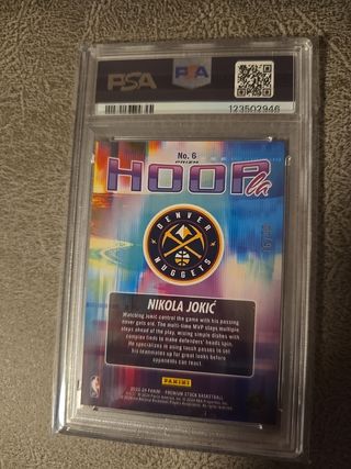Esta tarjeta representa una combinación perfecta entre el dominio de un MVP y una estética visualmente impactante. Al ser una variante "Blue Ice", su acabado refractante crea un patrón de "hielo quebrado" que resalta enormemente bajo la luz. Especificaciones Principales: Jugador: Nikola Jokić (Denver Nuggets). Año/Colección: 2023 Panini NBA Hoops Premium Stock. Insert: Hoopla. Paralelo: Blue Ice (Hielo Azul). Número de Tarjeta: #6. Estado y Certificación: La tarjeta ha sido evaluada por PSA (Professional Sports Authenticator), la entidad de mayor prestigio en el mercado de coleccionables. Grado: GEM MT 10 (Gem Mint). Signi