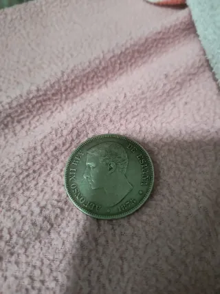 Moneda de Alfonso XII del año 1875. - Canto con estrellas y leyendas. - Anverso: Retrato de Alfonso XII. - Reverso: Escudo de España.
