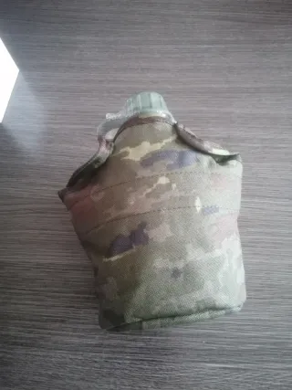 Cantimplora militar con funda de camuflaje boscoso pixelado y gabata metálica con asas de acero inoxidable. Cantimplora Verde Capacidad: 1 Litro Color verde oliva militar Tapón de seguridad con sujeción para evitar pérdidas. Ideal para coleccionistas militares, supervivencia, bushcraft, airsoft, senderismo o acampada. Una pieza auténtica de dotación militar española, resistente y práctica. - Funda con enganche/anclaje metálico para el cinturón