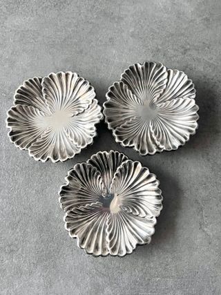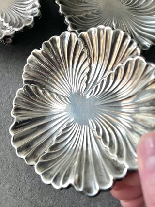 Plata de Ley (925 mm.) Lleva contraste de plata y firma del fabricante, Pedro Durán, con forma de flor de plata punzonada. No se venden por separado. Diámetro 100x100x20mm. Peso 33,56 g. Nunca se han usado. Han permanecido en una vitrina
