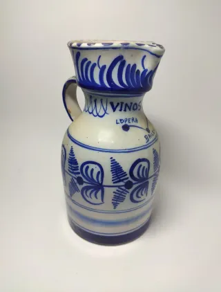 Jarra de cerámica para vino vintage tradicional de Jaén, pintada a mano con motivos azules. - Presenta desconchones como se puede ver en las fotos. - Pintada a mano. - Diseño con motivos florales y líneas. - Inscripción VINOS DE JAEN, Lopera, Bailen, Torreperogil. - Hago envío bien embalado y protegido.