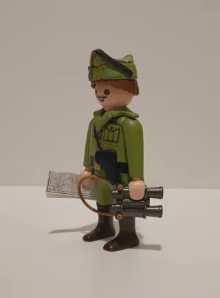 Figura Playmobil customizada de un oficial del ejército republicano. - Uniforme verde con detalles. - Gorra militar. - Porta-arma y pistola. - Prismáticos. - Mapa.