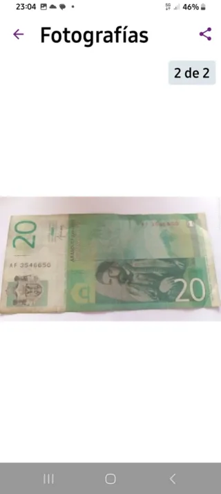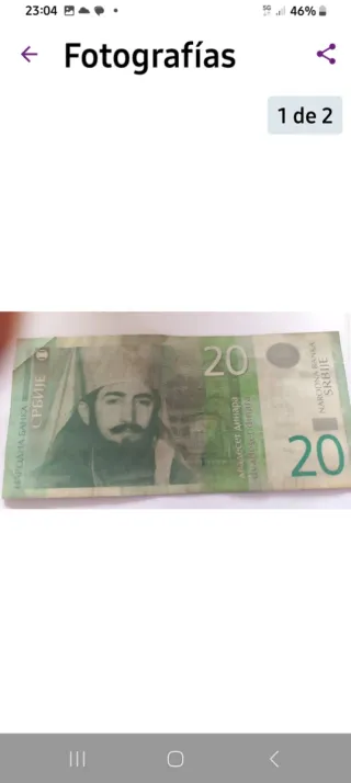 Billete de 20 dinares de Serbia del año 2013. El diseño presenta al frente un retrato y al reverso el escudo del país. - Denominación: 20 Dinara - Año: 2013 - País: Serbia - Texto en serbio: Narodna banka Srbije, dvadeset dinara
