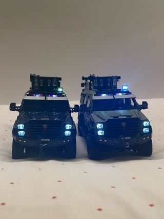 Réplica detallada de una furgoneta SWAT a escala 1:24. Ideal para coleccionistas. - Diseño inspirado en vehículos tácticos. - Luces LED delanteras y superiores. 25 cada una