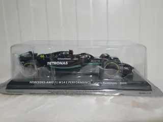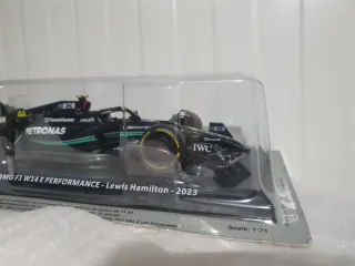 Réplica a escala 1:24 del Mercedes-AMG F1 W14 E Performance, pilotado por Lewis Hamilton en la temporada 2023. - Modelo detallado del coche de Fórmula 1. - Presentado en su embalaje original. - Escala 1:24.