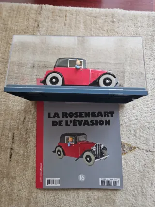 Réplica del coche de Tintín a escala 1/24. - Modelo del coche Rosengart de l'évasion. - Incluye figura de Tintín. - Presentado en vitrina protectora.
