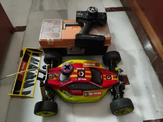 Coche radiocontrolado Kyosho Inferno TT a escala 1/8, con motor de gasolina. Se incluye un juego de ruedas Coche, emisora, dos chispometros y mesa de arranque.