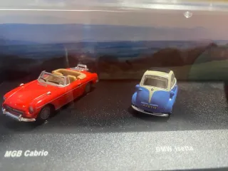 Conjunto de 8 coches en miniatura de la marca Schuco. Modelos a escala 1/72. - MGB Cabrio - BMW Isetta - Ford Capri - Morgan Plus Eight - VW Escarabajo Cabrio - VW Escarabajo - VW Bus Samba - VW Bus (Tipo 2)