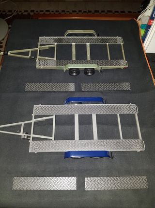 ⛔ NO NEGOCIABLE ⛔ ✅ Se venden dos remolques de metal a escala 1/18 de la marca OttO mobileestan buen estado. A uno le falta la 5° rueda por lo demas estan bien, no tienen caja ambos . Son de color dorado y azul oscuro, 📦 ENVIO PREVIO PAGO 9€ CERTIFICADO.