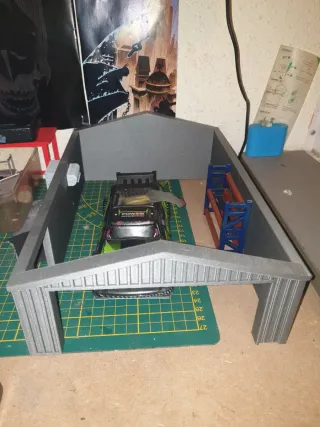 Garaje para coches rc y maquetas a escala 1/28. Tal y como se ve en la imagen, sin tejado, con estantería para llantas, aire acondicionado, (carrocería no incluida)