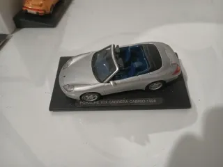 Réplica a escala 1:43 del Porsche 911 Carrera Cabrio de 1998. Un modelo detallado para coleccionistas. - Color plateado. - Interior en azul. - Base expositora negra con el nombre del modelo.