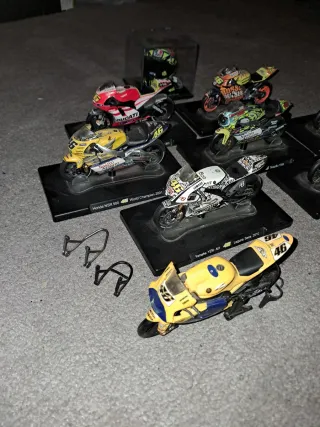 Colección de nueve motos a escala 1/18. - Modelos variados de motocicletas. - Bases individuales para exposición. En buen estado del mitico VALENTINO ROSSY casco de regalo por defecto - una de ellas sin abrir.