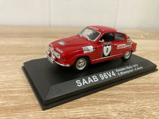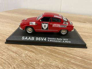 Réplica detallada del coche SAAB 96V4 que compitió en el Rally de Suecia de 1972. - Modelo a escala del SAAB 96V4. - Decoración del Rally de Suecia 1972. - Pilotos S. Blomqvist - A. Hertz. - Base expositora con nombre del modelo y evento.