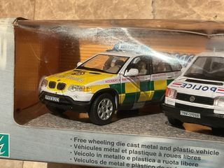 Conjunto de 5 vehículos de servicios a escala 1/43 Metal de la marca Cararamama. BMW X5, Mercedes ML, 2 x Volkswagen y Mercedes clase C. Nuevos a estrenar en su caja original, como se ve en las fotos. - Incluye un coche de policía, una ambulancia, un vehículo de bomberos y dos furgonetas de servicio. - Modelos detallados y en perfecto estado.