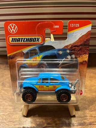 Coche de juguete Matchbox Volkswagen Beetle 4x4. Modelo a escala con diseño todoterreno. 🛑 Solo hago envios por importes iguales o superiores a 8€. ⭕️ Para importes menores de 8€ recogida en mano. 👍 Es un buen articulo para tu vitrina. 🚚 Agrupo pedidos. ⚠️ Revisa mi perfil. Majorette Hot Wheels Matchbox - Color azul con detalles en amarillo y naranja. - Ruedas todoterreno con llantas doradas. - Fabricado en metal.