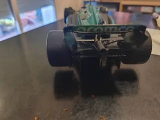 Dos coches de carreras a escala del equipo Lotus. - Coche negro con dorsal 15 y patrocinio John Player Special. Le falta el alerón trasero. - Coche verde y amarillo con dorsal 8 y patrocinio Team Lotus.