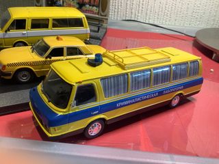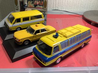 Lote de tres coches a escala 1/43, representando vehículos de servicio público de la URSS. Son un VOLGA, UAZ 2203 y autobús Zil 118 K. - Un autobús amarillo con detalles azules y texto en cirílico. - Un taxi amarillo con techo negro y detalles de tablero de ajedrez. - Una furgoneta amarilla y blanca.