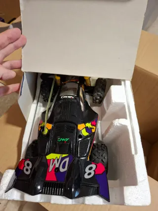 Coche de radiocontrol Nikko Dictator Midi a escala 1/18. Un modelo clásico de Nikko. - Incluye embalaje e instrucciones originales - Diseño deportivo y llamativo. - Incluye el coche y su antena. - Ruedas de tacos para todo terreno.