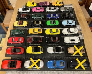 Colección de 26 coches a escala de metal. Vienen sobre una base inclinada para verse mejor expuestos. Cada uno mide unos 10 cm. - Modelos variados de Porsche. - Incluye diferentes versiones y años como Coupé, Cabrio y Targa. - Fabricados en metal. En la segunda foto pueden verse tachados los que no están disponibles. SE VENDEN TODOS JUNTOS