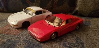 se vende pack de coches a escala, el primero es un ferrari testarossa de 1984, con transmisión de las ruedas al volante, en perfecto estado salvo toques en pintura, el otro es un Porsche carrera 911 de 1993, también en muy buen estado salvo toques en pintura, con transmisión de las ruedas al volante, escala 1/24, fabricados en italia por Burago, se entrega en mano en Guadalajara o se manda a cualquier punto de españa por correos a través de Wallapop
