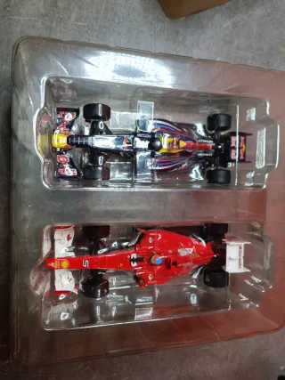 Set de dos coches de Fórmula 1 a escala 1/32 de la marca Carrera. Nuevos y precintados - Coche Red Bull Racing. - Coche Ferrari.