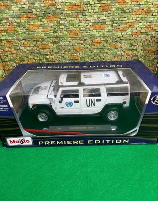 🚙 Hummer H2 “UN” – Maisto Premiere Edition – Escala 1:18 Modelo Hummer H2 de la serie Premiere Edition fabricado por Maisto, en escala 1:18, con un acabado muy detallado y realista. ✔️ Pintura blanca con emblemas de la ONU (United Nations) ✔️ Interior detallado y ruedas funcionales ✔️ Carrocería metálica con piezas de plástico ✔️ Se entrega en su caja original, completamente nuevo Perfecto para coleccionistas o para decorar vitrinas y dioramas. 📦 Entrego bien protegido. 🔁 Mira mi perfil para más coches a escala 1:18. ❓¿Dudas? Escríbeme sin compromiso.